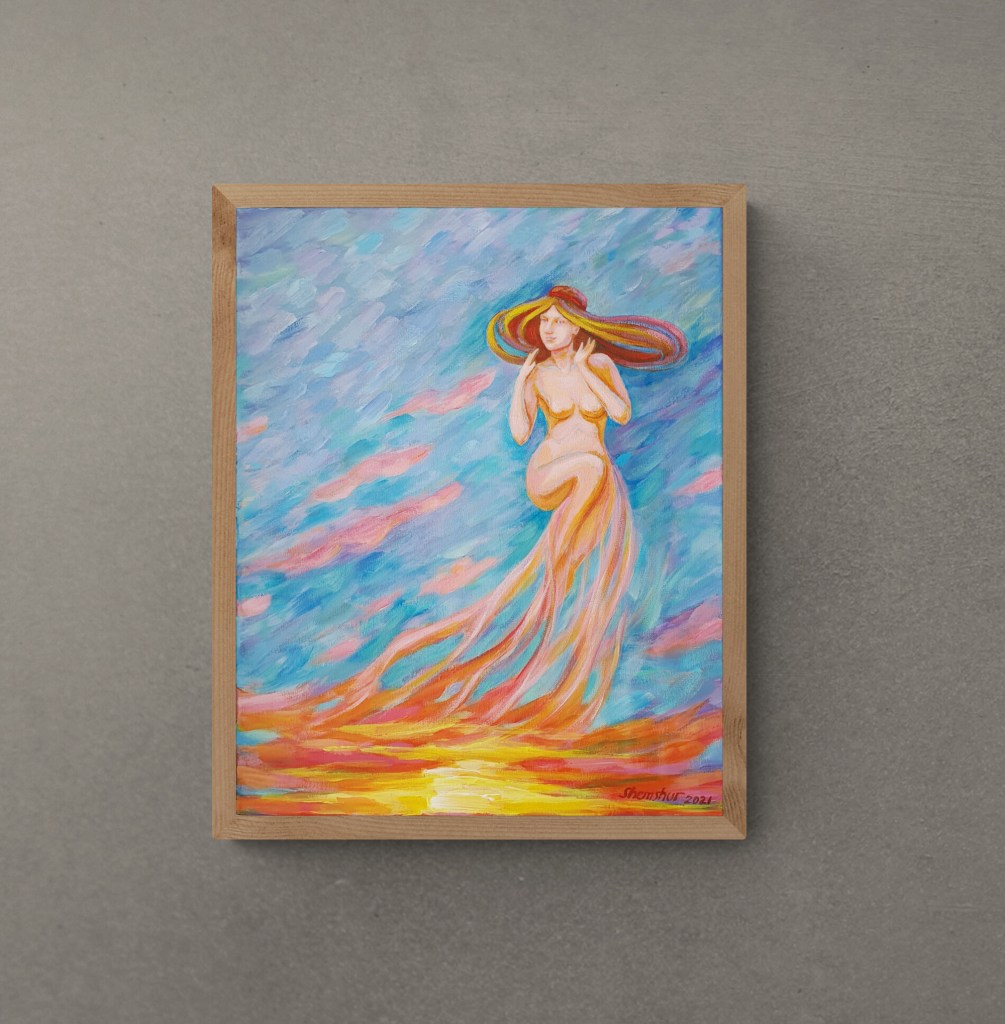 I love watching the sunrise. When I saw the unusually bright dawn of the sun, it seemed to me that now young Aurora is being born. This became the idea behind my painting.