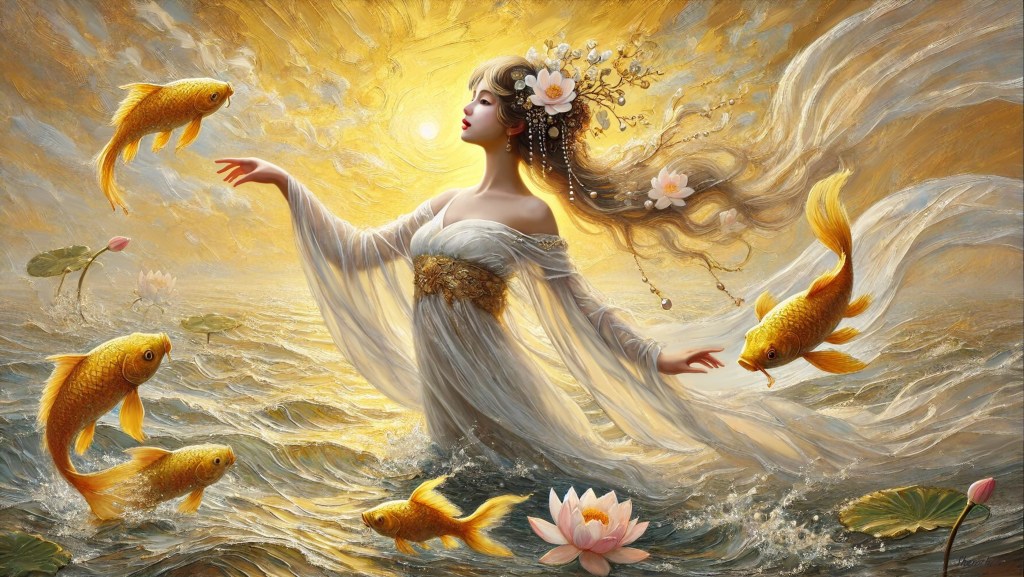 Artwork details Medium : Giclée print on Canvas , Wood Framing : Framing on request Dimensions : 24x42in Edition : 47 / 50 Artist’s proof : 3 Hors commerce : 3 About this artwork In creating this piece, I envisioned a realm where the essence of serenity and vitality merge harmoniously. I chose to represent this union through the synergy between the fluid grace of the koi fish and the ethereal, tranquil form of the woman, encapsulating a moment of pure fulfillment and peace. Each element, from the subtle flow of her gown to the dynamic swirls in the waters, emphasizes a balance between movement and stillness, aiming to inspire a sense of tranquility and inspiration in your living space. This Giclee art is printed in color on artist-quality canvas, has a UV coating, and is stretched on premium wood stretchers. Once you reserve your digital painting, it will take me a few days to print it and have it ready to ship to you as soon as possible. This process usually takes about 5-7 business days. It will then be sent to your home address. All giclee prints will be signed on the back to ensure authenticity as my artwork.