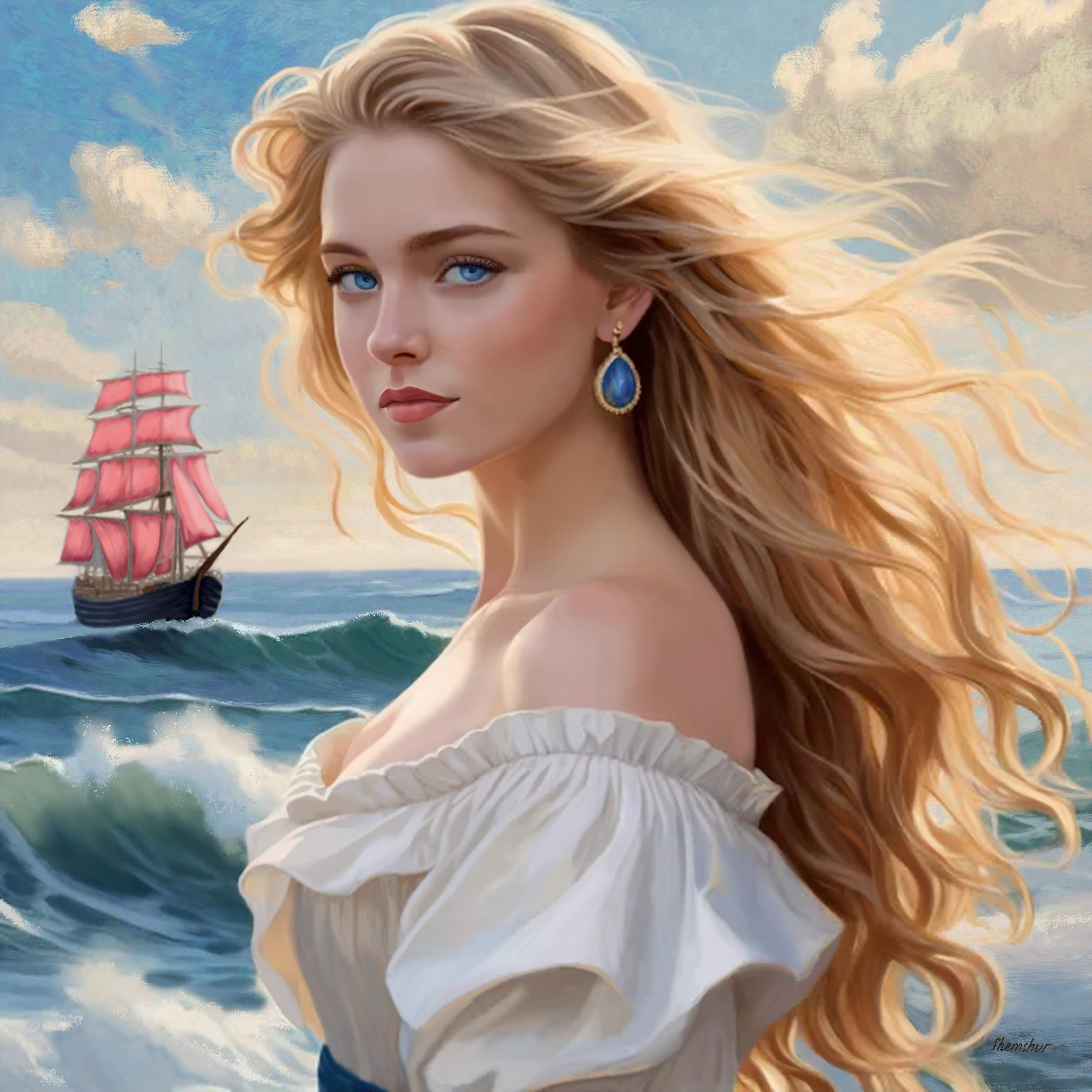 Artwork details Medium : Giclée print on Canvas , Wood Framing : Framing on request Dimensions : 30x30in Edition : 4 / 50 Artist’s proof : 50 Hors commerce : 3 About this artwork In creating this piece, I was inspired by the sense of adventure and the timeless beauty of the human spirit. The young woman, poised elegantly against a backdrop of tumultuous seas and a distant ship, symbolizes our journeys. Her windswept hair and serene expression evoke a sense of freedom and the bravery to follow one’s heart, regardless of the obstacles ahead. In the distance, a majestic ship with crimson sails glides across the waves, symbolizing dreams, aspirations, and the promise of a brighter future. This artwork will bring an energy of inspiration and beauty to any space, encouraging viewers to dream big and sail toward their true desires. This Giclee art is printed in color on artist-quality canvas, has a UV coating, and is stretched on premium wood stretchers. Once you reserve your digital painting, it will take about 5-7 business days to print it and have it ready to ship to you as soon as possible. It will then be sent to your home address.