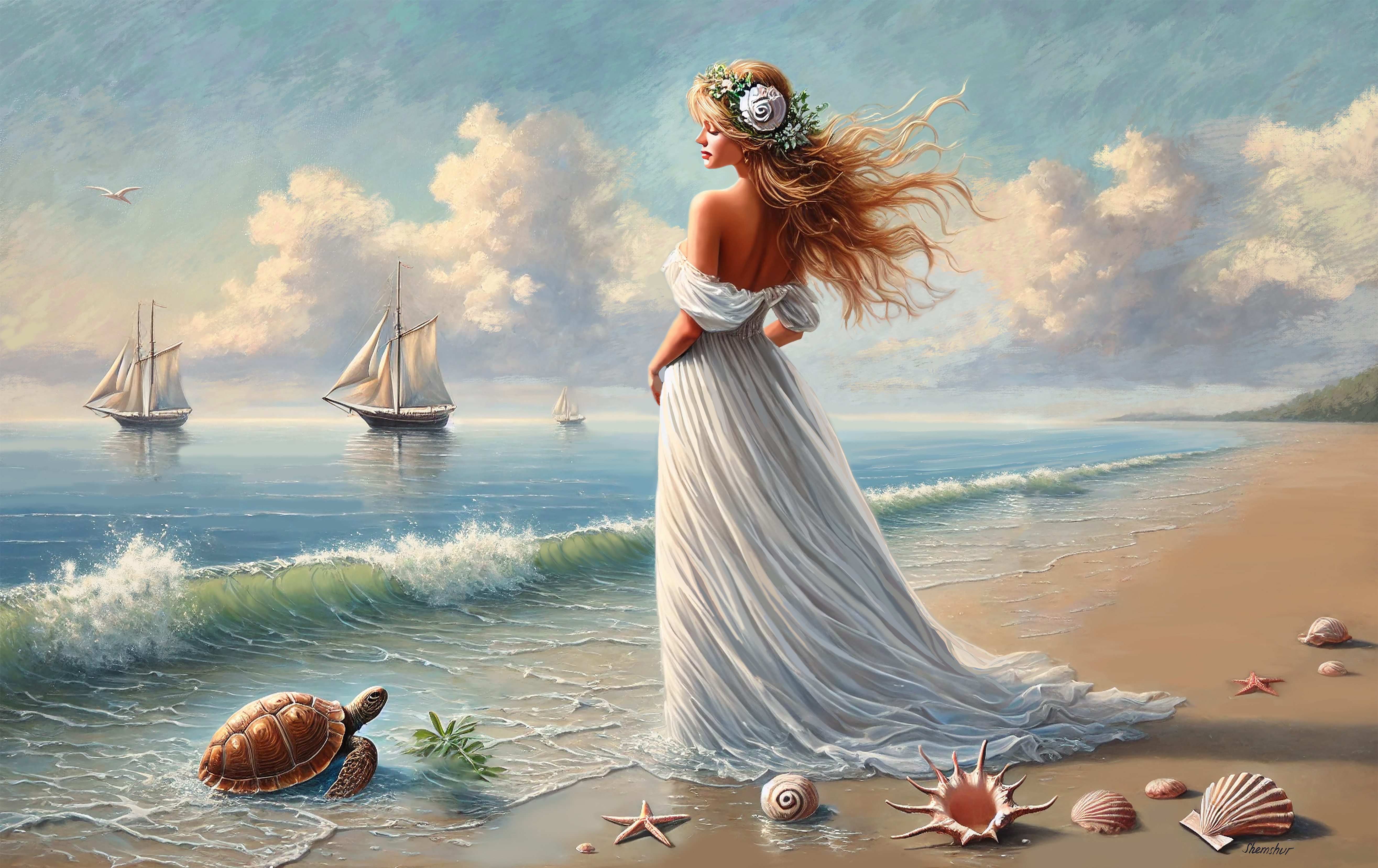 Artwork details Medium : Giclée print on Canvas , Wood Framing : Framing on request Dimensions : 26×41.8in Edition : 47 / 50 Artist’s proof : 3 Hors commerce : 3 About this artwork In this artwork, I sought to capture the serene embrace between the human spirit and the vast, untamed beauty of the sea. The figure, adorned in a flowing gown, symbolizes tranquility and connection with nature. Every brushstroke and hue embodies a quiet dialogue with the winds, waves, and wildlife, conveying a sense of peace and harmony. This piece invites tranquility into any space, illuminating it with the gentle energy of a seaside escape. This Giclee art is printed in color on artist-quality canvas, has a UV coating, and is stretched on premium wood stretchers. Once you reserve your digital painting, it will take me a few days to print it and have it ready to ship to you as soon as possible. This process usually takes about 5-7 business days. It will then be sent to your home address. All giclee prints will be signed on the back to ensure authenticity as my artwork.