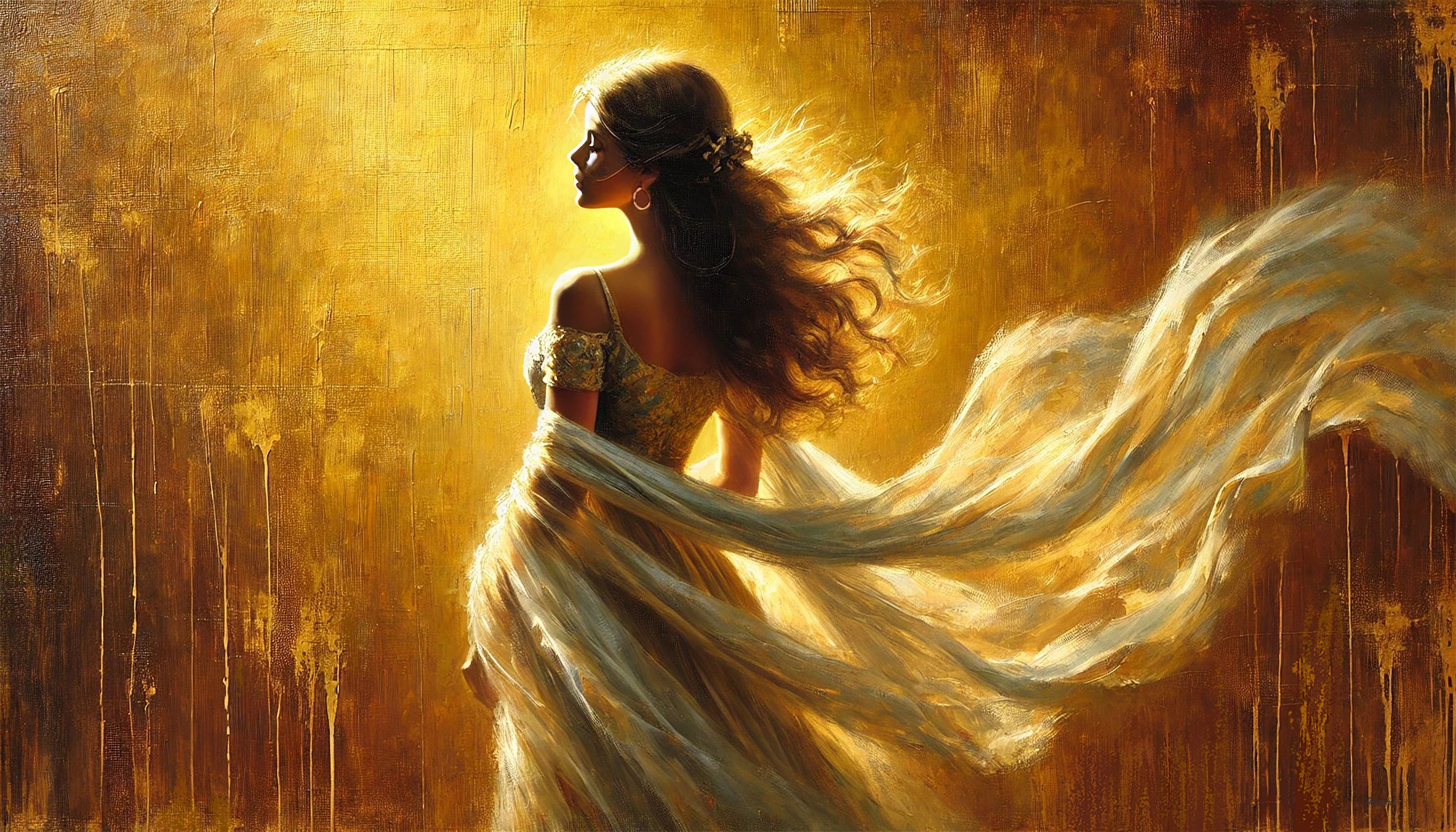 Artwork details Medium : Giclée print on Canvas , Wood Framing : Framing on request Dimensions : 23x40in Edition : 52 / 55 Artist’s proof : 3 Hors commerce : 3 About this artwork In creating this artwork, I sought to capture light’s ethereal and luminous essence as it dances around a figure enveloped in a flowing gown. The warm, golden tones and the soft blending of colors echo with a sense of freedom and grace. This piece celebrates beauty and movement, inviting the viewer to feel uplifted and inspired by life’s radiance and flow. It holds an energy that I believe will bring warmth and dynamic beauty to any space it inhabits. This Giclee art is printed in color on artist-quality canvas, has a UV coating, and is stretched on premium wood stretchers. Once you reserve your digital painting, it will take me a few days to print it and have it ready to ship to you as soon as possible. This process usually takes about 5-7 business days. It will then be sent to your home address. All giclee prints will be signed on the back to ensure authenticity as my artwork.